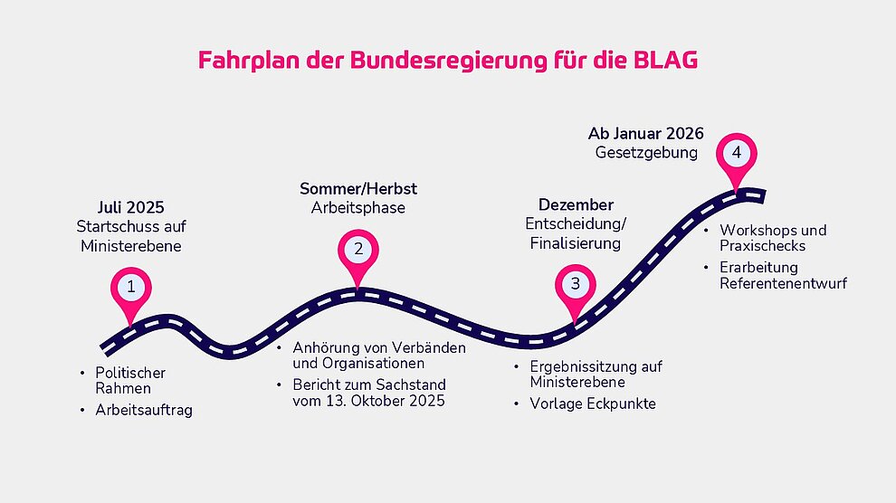 In einer gemeinsamen Sitzung hat sich am 7. Juli 2025 die Bund-Länder-Arbeitsgruppe (BLAG) in Berlin konstituiert und sich auf das weitere Vorgehen für eine Reform der Pflegeversicherung verständigt. Am 11. Dezember 2025 legte die Arbeitsgruppe „Zukunftspakt Pflege“ ihre fachlichen Eckpunkte vor, die im kommenden Jahr in ein Gesetzgebungsverfahren einfließen und in einem Gesetz für eine nachhaltige Pflegestruktur- und -finanzierungsreform münden sollen. In der Roadmap des Bundesgesundheitsministeriums heißt es, dass das Gesetz "möglichst Ende 2026 in Kraft treten" soll. Alle Maßnahmen stehen dabei laut Koalitionsvertrag unter Finanzierungsvorbehalt.